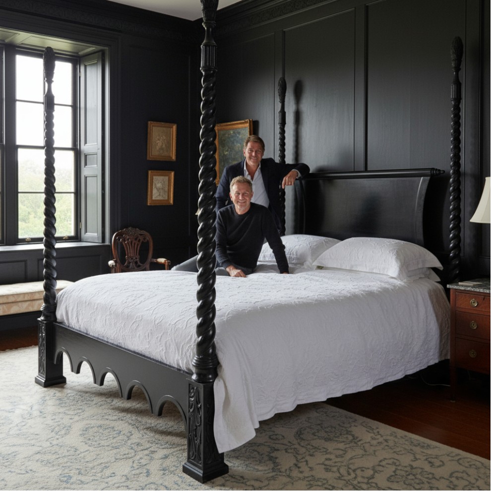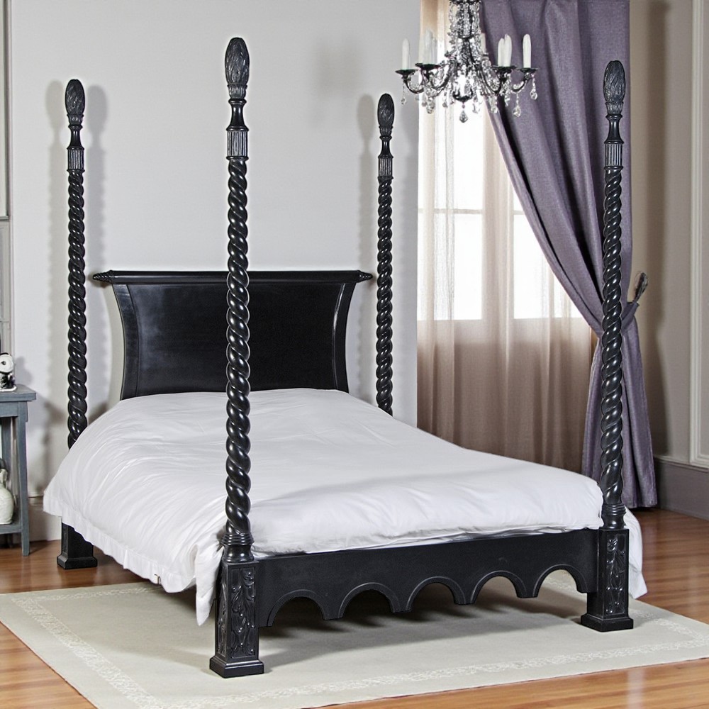 6ft Four Poster Bed – French Antique Black – Crafted from solid mahogany with hand carved corner posts.