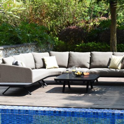 The outdoor garden sofa truly unifies your inside and outside space by blurring the lines between your house and garden, whilst still retaining the look of a sofa that belongs outside. Paired with a slatted aluminium coffee table and matching legs, the frames compliment the high performance outdoor fabric colour.