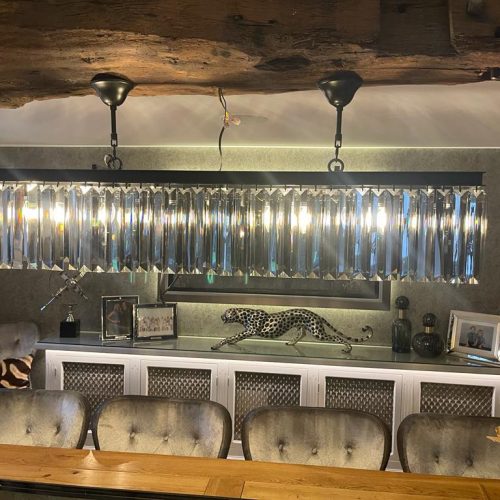 - The rectangular glistening crystals hang from different tiers, capturing and refracting light to create dramatic patterns on surrounding surfaces